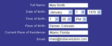There are 5 details required for most reports: Your full name (first name only can be used, if desired), birth month, day and year, birth time, birth place, and current place of residence. Please use Month/Day/Year format
